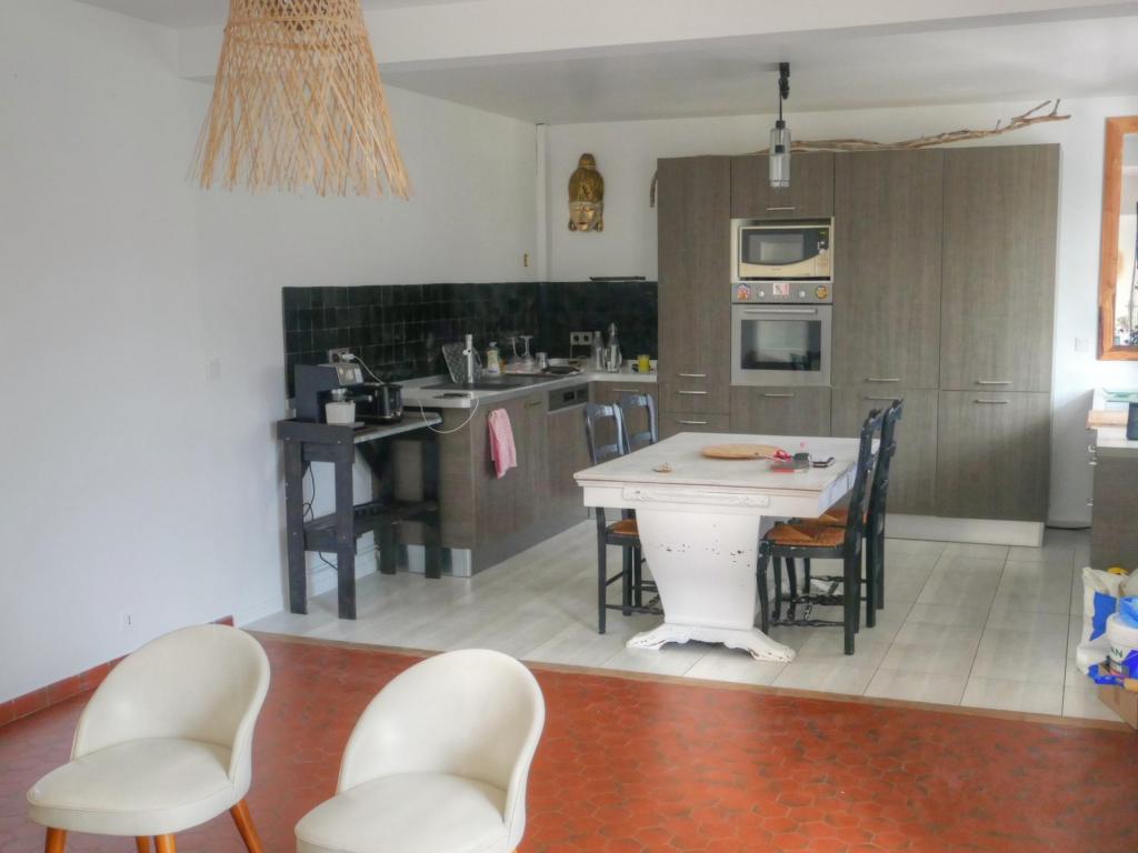 - A l'étage, accès par un escalier extérieur sécurisé, une entrée, 3 chambres, avec sanitaire complet, cuisine séparée de 15.5m2 et d'un séjour 33m2 entourée d'un balcon avec un barbecue et espace détente avec vu sur le terrain.